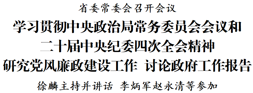 1月10日,省委常委会召开会议,学习贯彻习近平总书记在1月9日中央政治局常务委员会会议和二十届中央纪委四次全会上的重要讲话精神,学习贯彻全国宣传部长会议精神,讨论拟提请省第十四届人民代表大会第三次会议审议的《政府工作报告》稿,研究相关工作。