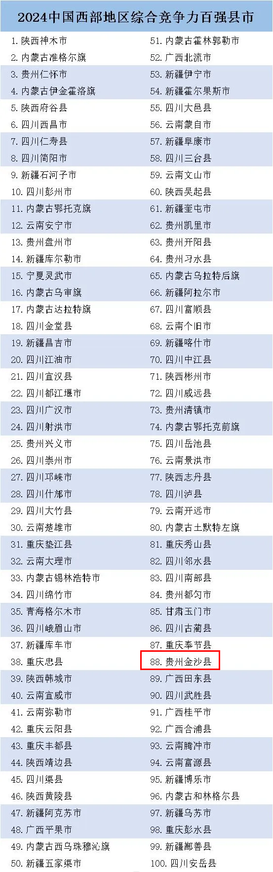 竞争力智库北京中新城市规划设计研究院等机构在北京发布《中国县域发展监测报告2024》其中金沙县上榜2024中国西部地区综合竞争力百强县市七星关区上榜2024中国西部地区综合竞争力百强区