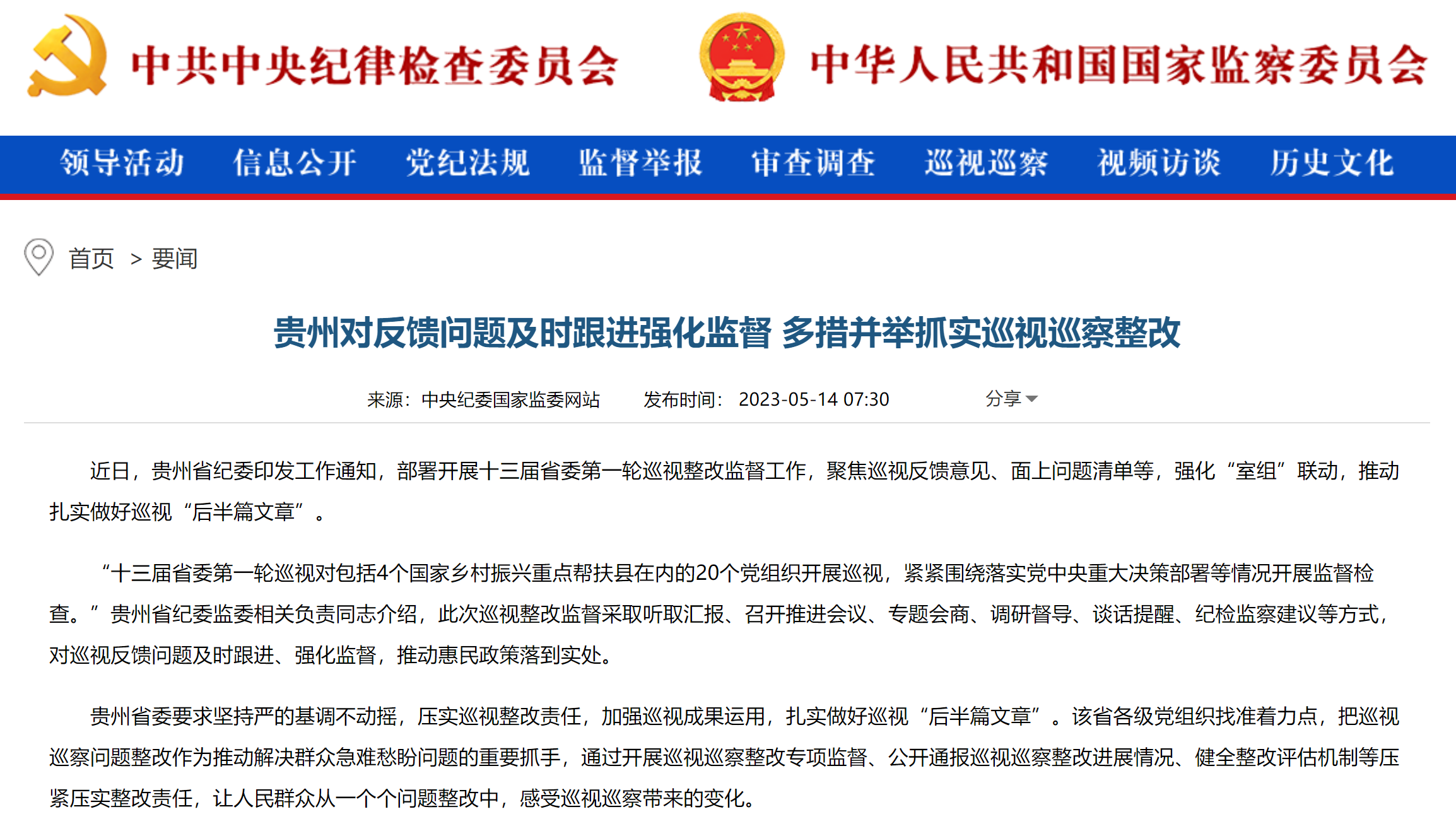 《中国纪检监察报》、中央纪委国家监委网站丨 贵州对反馈问题及时跟进强化监督 多措并举抓实巡视巡察整改