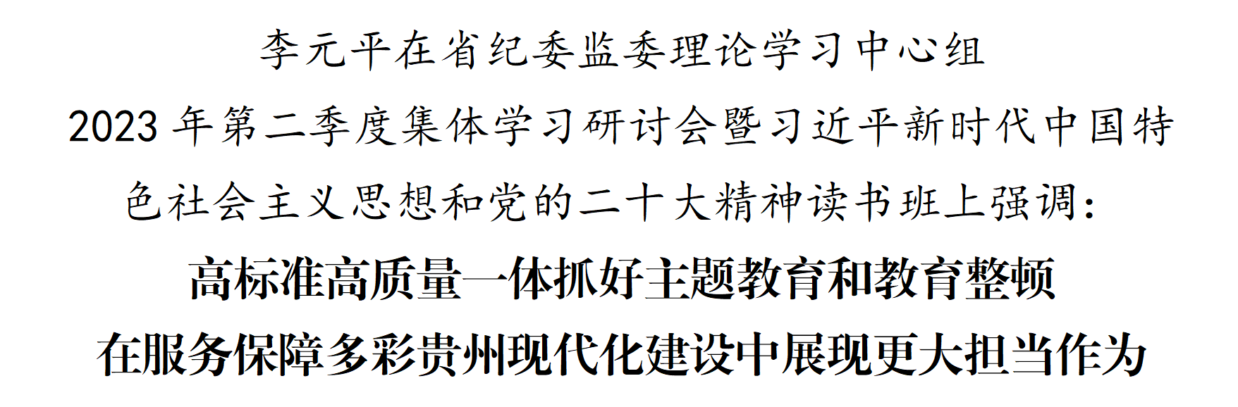 李元平强调,要坚持把主题教育、教育整顿与贯彻落实党中央关于全面从严治党新部署新要求结合起来,主动融入大局、服务大局,找准纪检监察工作的切入点着力点,不断巩固拓展全面从严治党成果,为推动党的二十大擘画的宏伟蓝图变成美好现实,提供强有力的政治引领和政治保障。聚焦贯彻党的二十大精神推进政治监督具体化精准化常态化,保障中国式现代化各项决策部署在贵州落地见效。坚持严的基调驰而不息正风肃纪,为高质量发展营造风清气正的良好环境。强化一体推进“三不腐”,坚决消除经济社会发展的重大风险隐患。推动健全监督体系,不断将制度优势转化为现代化建设效能。大兴调查研究,紧盯党中央、中央纪委国家监委提出的新课题新要求,用好深学习、实调研、抓落实工作方法,努力找寻破题的答案,使纪检监察工作思路举措更加科学、更加严密、更加有效,更好地服务保障贵州高质量发展、现代化建设。
