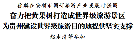 徐麟强调,要聚焦资源、客源、服务三大要素发力,不断提升安顺旅游业发展的层次和水平,把黄果树打造成世界级旅游景区。要精深开发资源,加强对黄果树“特意性”优质旅游资源的科学深度开发,用好自然、民族、文化、科技、地质等宝贵资源和优势,守好生态环境保护底线,严把建筑风貌关,确保项目为景所融、与景相融。要广泛拓展客源,线上线下、境内境外共同发力,吸引更多境内外游客到安顺、到黄果树旅游。要全面提升服务,更好发挥比较优势“留客”,加快完善旅游服务业态。要大力培育引进优强旅游市场主体,做大做强骨干国企,积极引进国内外文旅行业头部企业,着力提升旅游项目开发运作水平。要加强规划引领,高起点编制实施黄果树世界级旅游景区规划,确保经得起历史检验。省有关部门要加大对安顺的支持力度,安顺市要扛起主体责任,统筹协调解决旅游发展和项目实施中的重大问题,形成强大的工作合力。全省各级各地要全面加强旅游安全工作,深入排查整治隐患,守好旅游安全“生命线”。