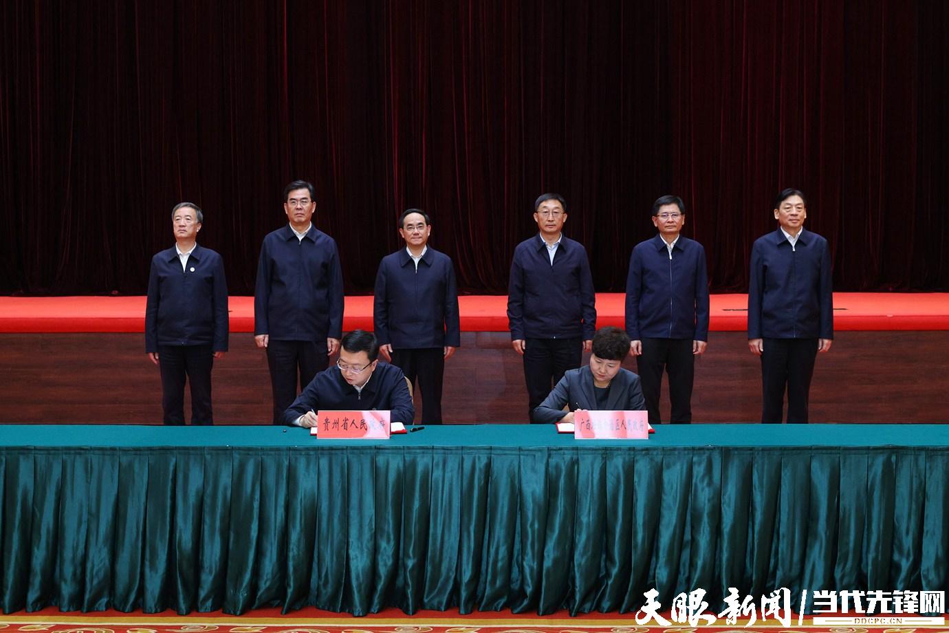 在刘宁、徐麟、蓝天立、李炳军、孙大伟、赵永清共同见证下,自治区党委常委、自治区常务副主席蔡丽新和贵州省副省长罗强签署两省区深化战略合作协议。