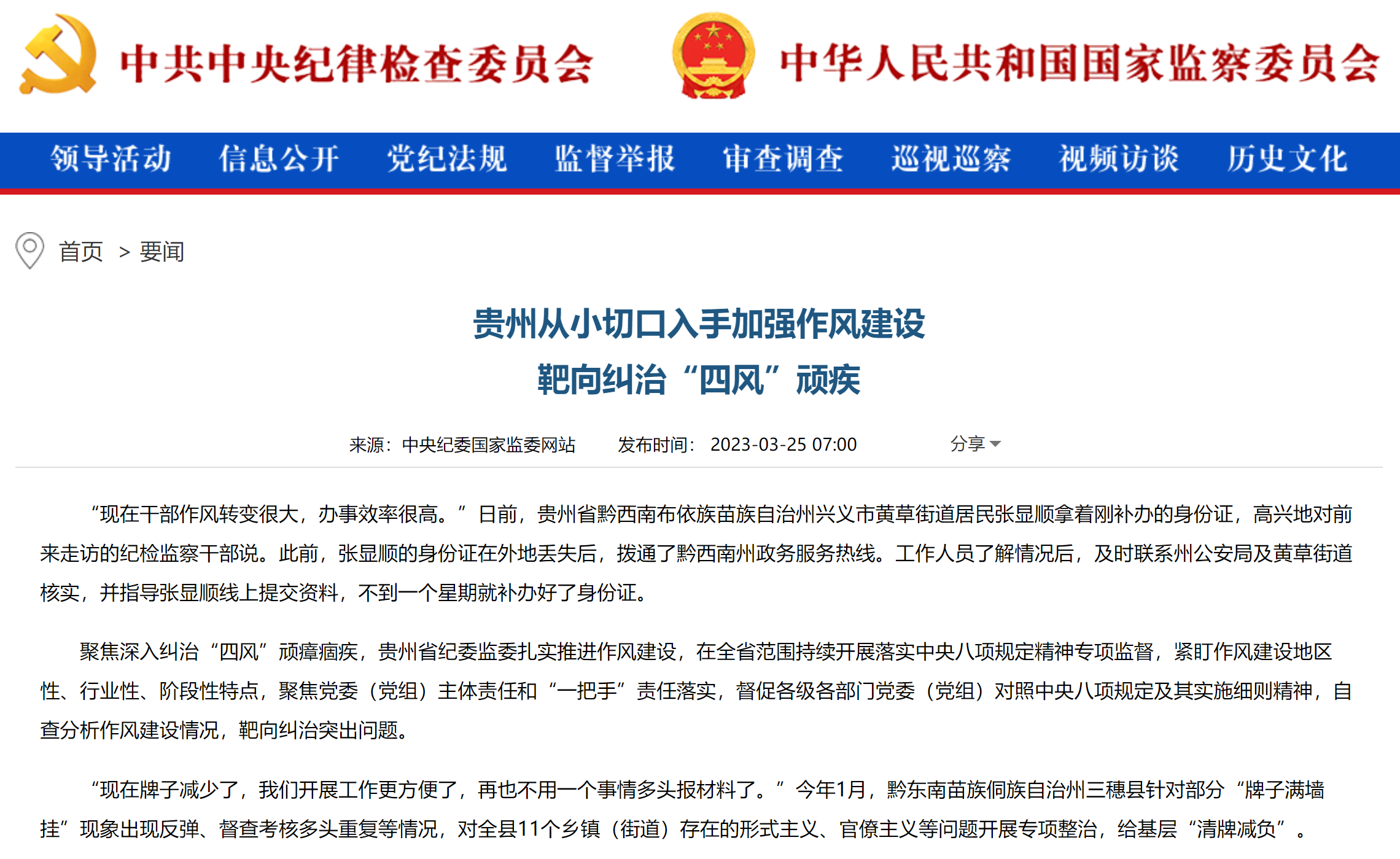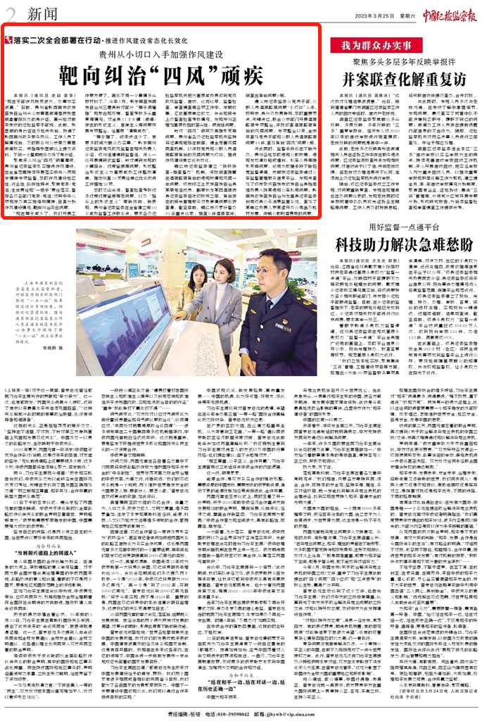 《中国纪检监察报》“新闻”版头条、中央纪委国家监委网站| 贵州从小切口入手加强作风建设 靶向纠治“四风”顽疾