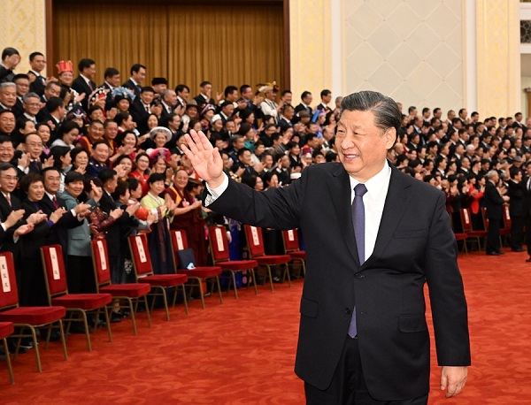 3月11日,中国人民政治协商会议第十四届全国委员会第一次会议在北京闭幕。闭幕会后,习近平等党和国家领导人与出席会议的全体政协委员合影留念。这是习近平向委员挥手致意。新华社记者 李学仁 摄