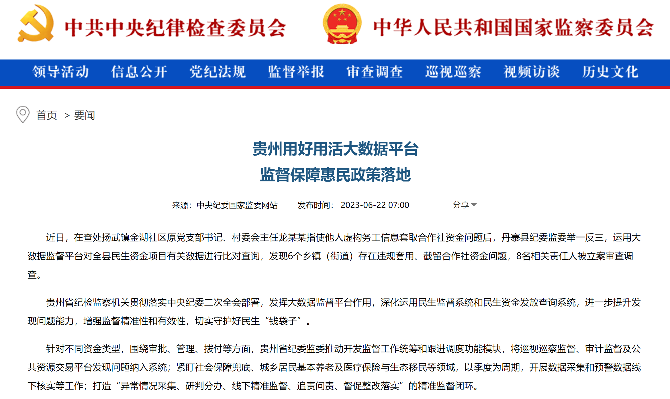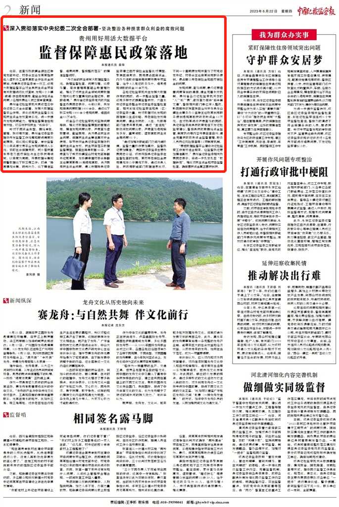 《中国纪检监察报》“新闻”版头条、中央纪委国家监委网站| 贵州用好用活大数据平台 监督保障惠民政策落地