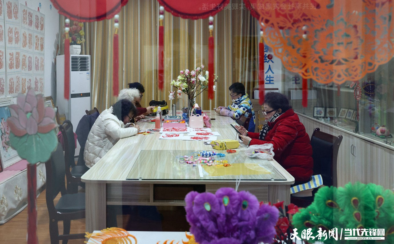 乌江恬苑社区党群服务中心内,居民们正在开展剪纸活动。