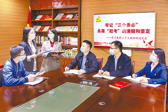 湖北省宜昌市纪委监委通过“宜纪论坛”“夜学课堂”等多种形式组织纪检监察干部持续深入学习领会党的二十大精神。图为近日,该市纪检监察干部在研讨交流学习党的二十大精神心得。唐强 摄