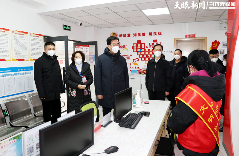 在太慈桥街道国际城社区,李炳军认真听取当地各项优化措施落实情况汇报