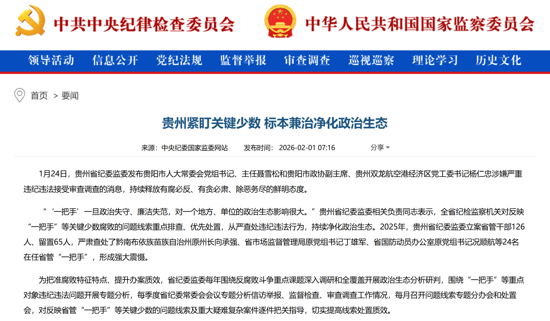 1月24日,贵州省纪委监委发布贵阳市人大常委会党组书记、主任聂雪松和贵阳市政协副主席、贵州双龙航空港经济区党工委书记杨仁忠涉嫌严重违纪违法接受审查调查的消息,持续释放有腐必反、有贪必肃、除恶务尽的鲜明态度。