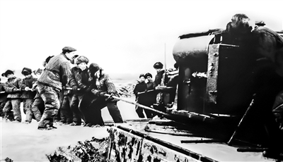 大庆“铁人”王进喜率领钻井队员用人拉肩扛的办法,把60多吨重的钻井设备运往工地。 图片来源:视觉中国