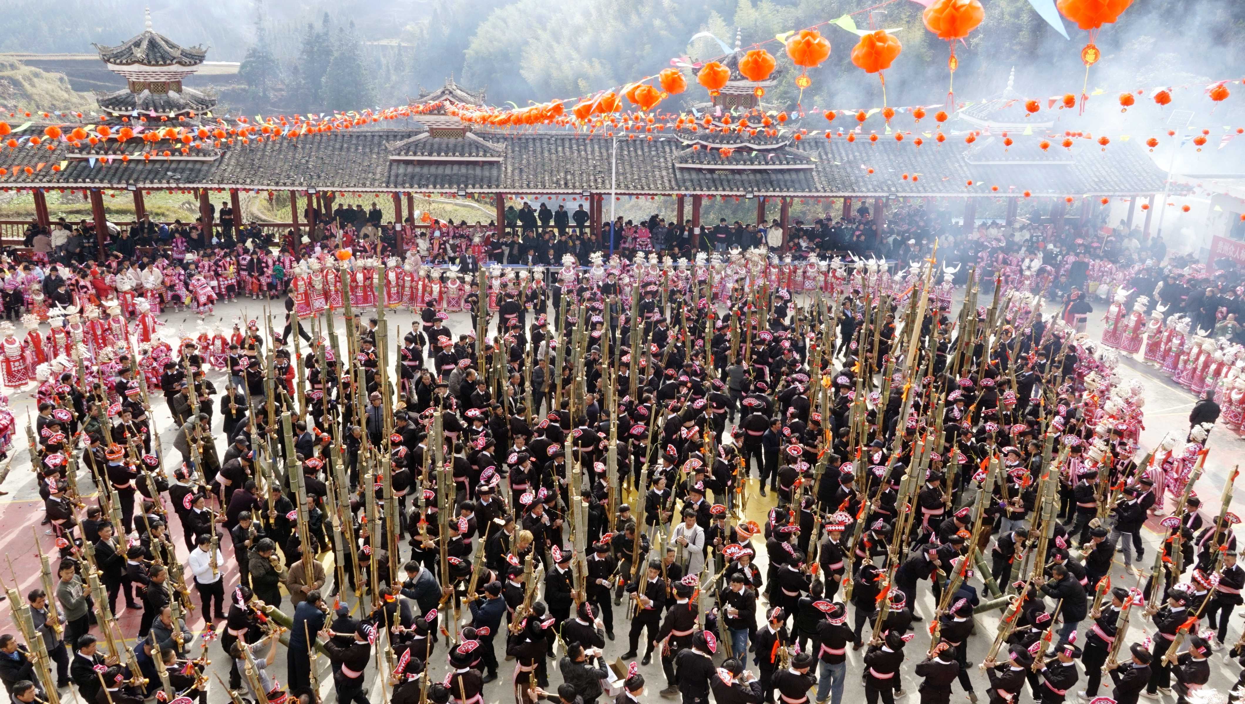 在黔东南州榕江县朗洞镇高略苗寨,百部芦笙同时奏起,苗族姑娘身穿节日盛装齐跳芦笙舞,祈福风调雨顺、五谷丰登。(黔东南州榕江县纪委监委供 韦文广 摄)
