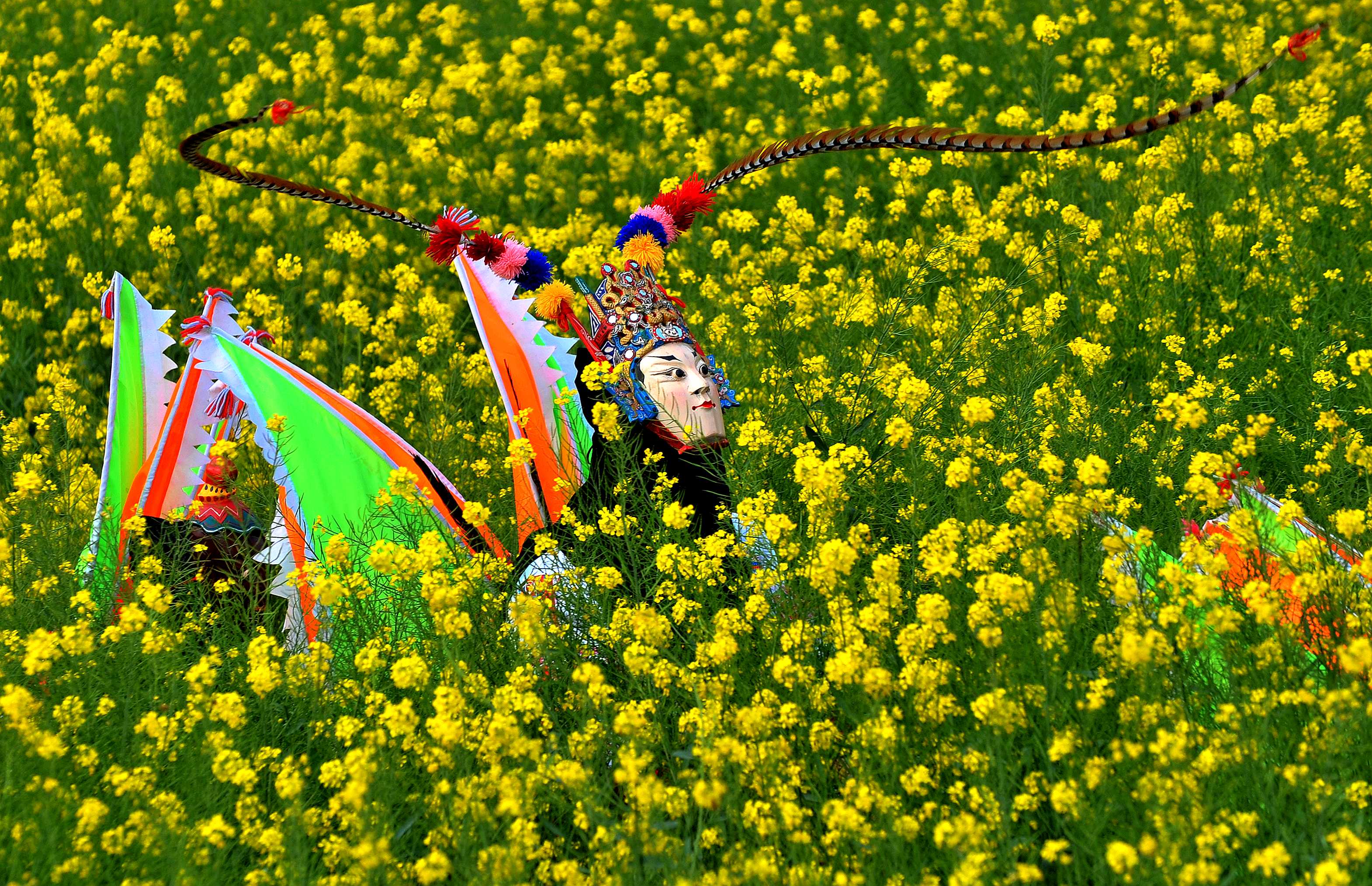 地戏被称为“戏剧活化石”,以其粗犷、奔放的艺术个性和深邃的文化内涵广受欢迎。在油菜花田中,地戏传承人尽情表演,一举一动都美轮美奂。(安顺市黄果树旅游区纪检监察工委供 古尚台 摄)