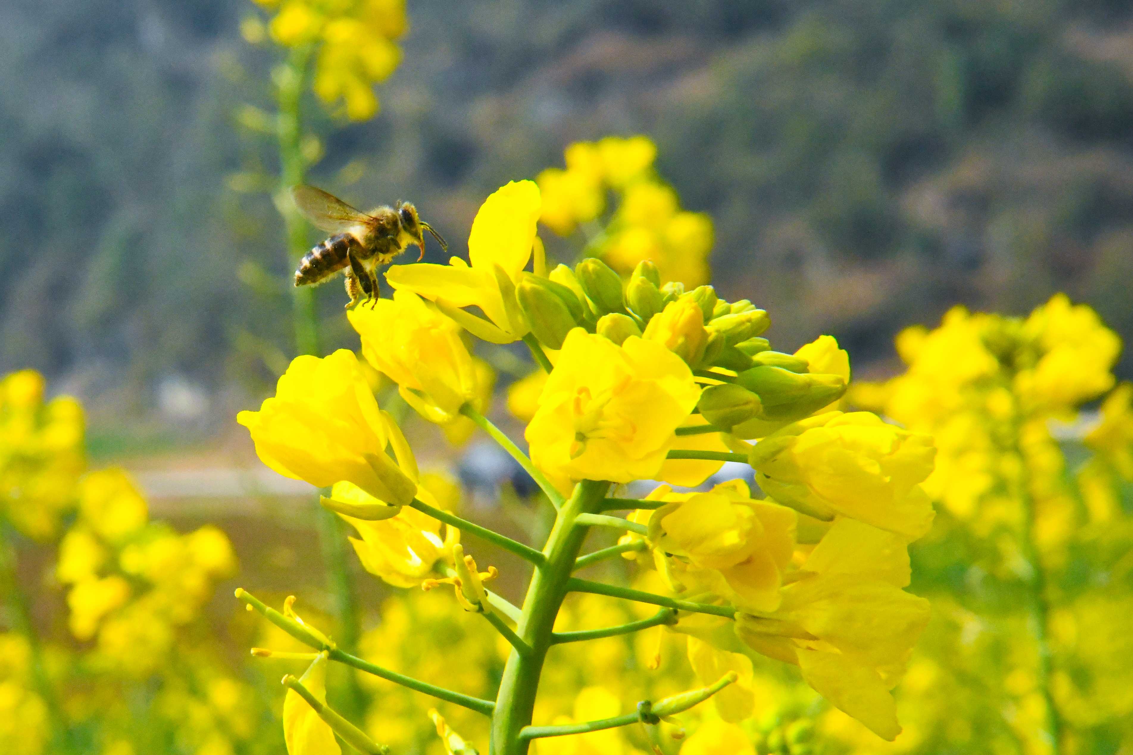 六盘水市六枝特区木岗镇抵簸村油菜花争相绽放,微风轻拂,阵阵清香,勤劳的小蜜蜂穿梭于花间,用心酿造春天的甜蜜。(六盘水市六枝特区纪委监委供 李越 摄)