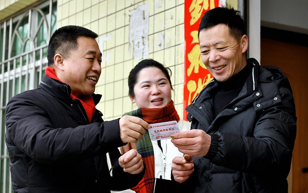 1月23日大年初二,重庆市涪陵区清溪镇纪委书记为返乡过节群众送上镇纪委党风政风监督卡,邀请村民参与村干部作风监督,并走访了解惠民政策落实情况。(重庆市涪陵区纪委监委 陈鹏宇 摄)
