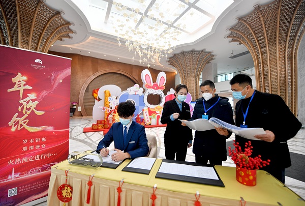 春节期间,浙江省台州市各大酒店订餐火爆。该市路桥区路北街道纪工委聚焦公款吃喝、违规吃请年夜饭等问题开展监督检查。(浙江省台州市路桥区纪委监委供 王保初 摄)