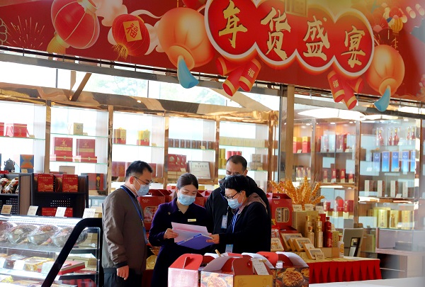 春节期间,广西壮族自治区梧州市纪委监委以“室组”联动方式,组建7个明察暗访组开展监督检查,强化正风肃纪。图为1月21日,该市纪检监察干部走访部分商超,了解是否存在违规发放年货福利问题。(广西壮族自治区梧州市纪委监委 吕晓艺 摄)