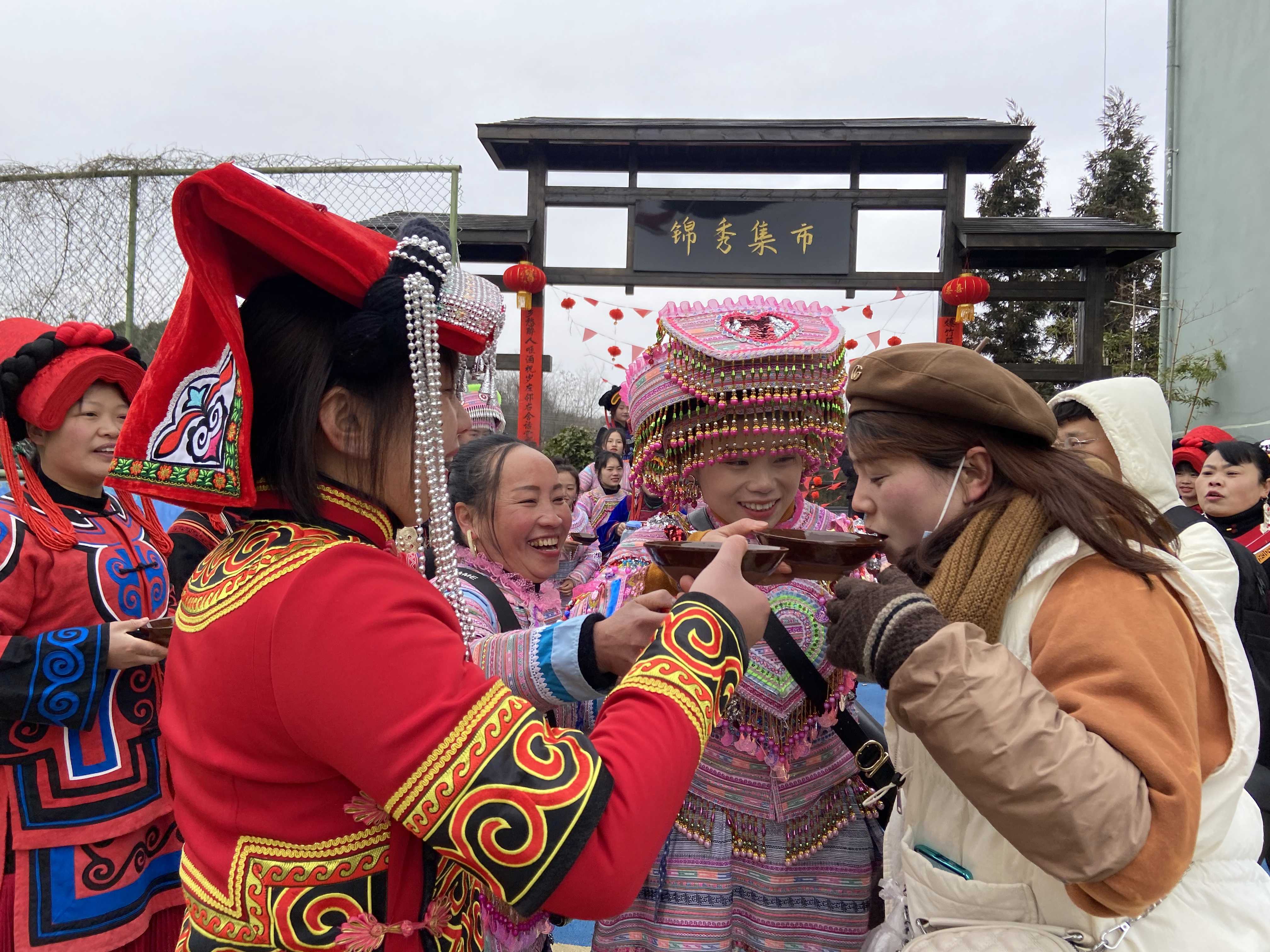 毕节市百里杜鹃管理区普底乡颖川村锦秀集市张灯结彩,举行猜灯谜、打糍粑、文艺演出等形式多样的新春活动,到处洋溢着欢乐。图为彝族儿女对前来参加迎春活动的游客及村民敬“拦路酒”。(毕节市百里杜鹃管理区纪检监察工委 胡婷 摄 )