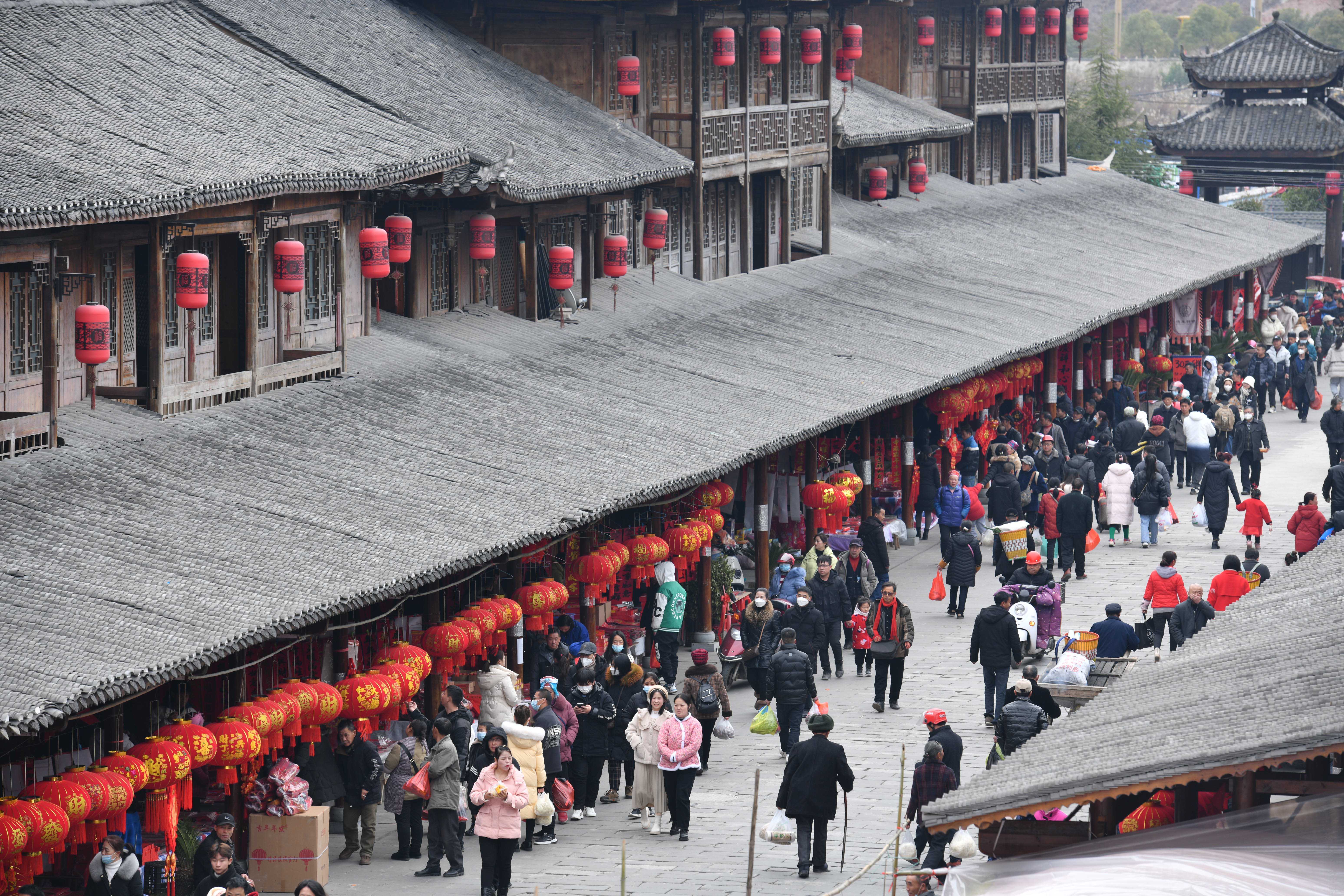 在黔东南州黄平县旧州古镇,游玩、购物的群众络绎不绝,尽享节日快乐时光。(黔东南州黄平县纪委监委供 梁文 摄)
