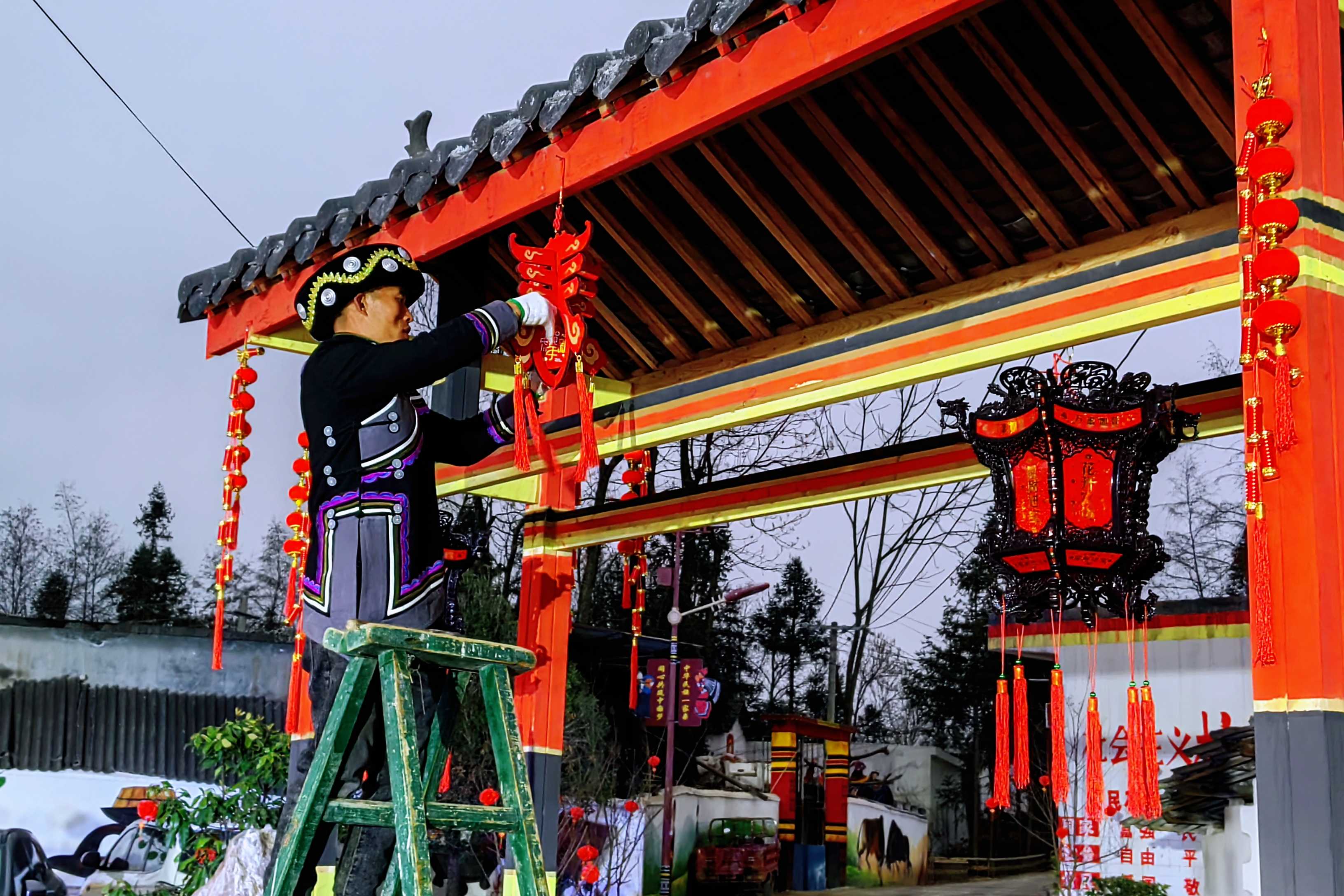 挂灯笼,迎新春。在黔西南州兴仁市大山镇野场村,家家户户张灯结彩,大红灯笼高高挂,形成了一道道鲜艳夺目的风景线,洋溢着浓浓的“中国年味”,寄托着村民们对美好新年的期许。图为黔西南州兴仁市大山镇彝族村民挂灯笼,迎接新春的到来。(黔西南州兴仁市纪委监委供 姚应丝 摄)