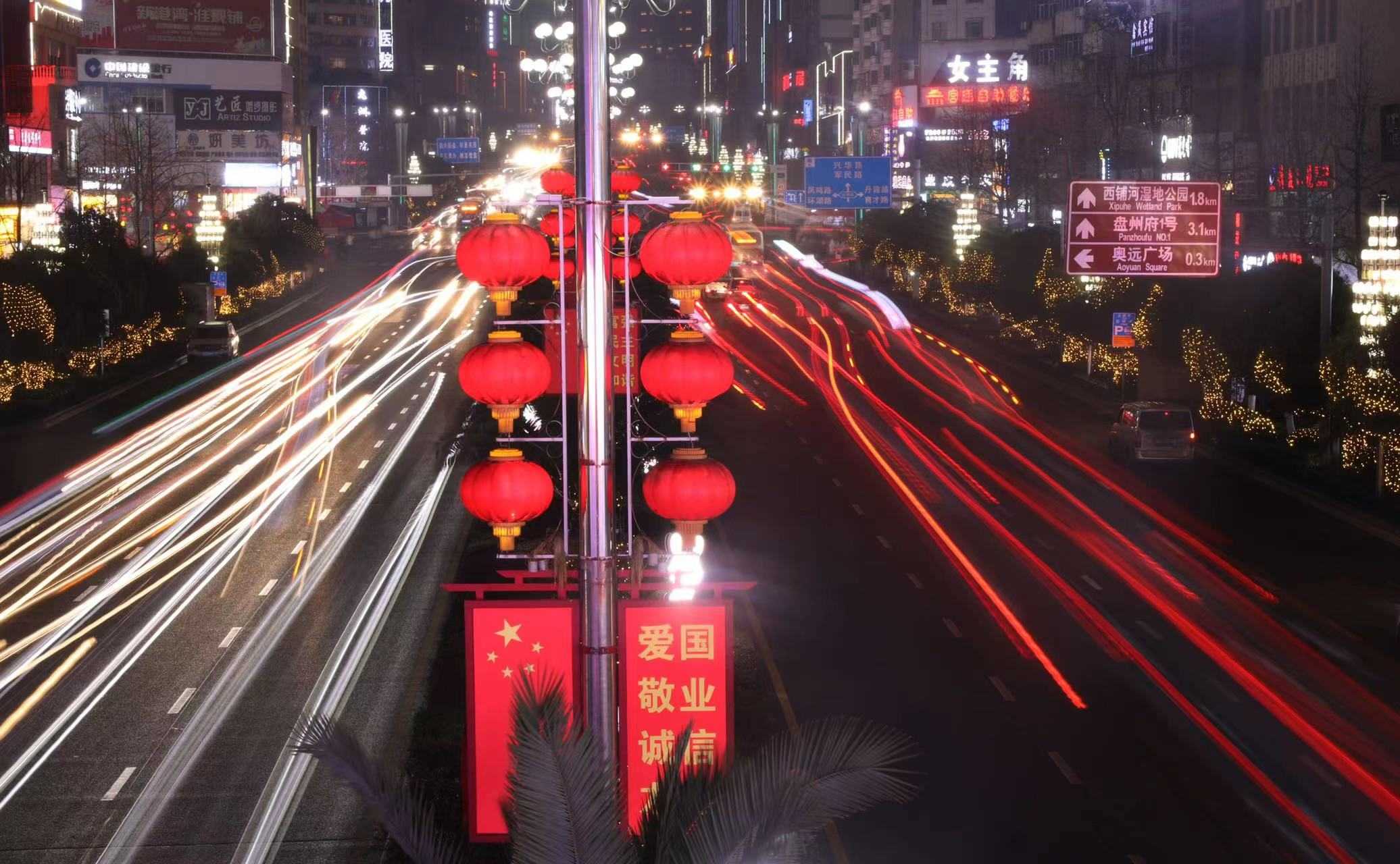 流金贺春,瑞兔送福。六盘水市盘州市张灯结彩,喜气洋洋,市区主要道路早早换上了喜庆的大红灯笼和兔年元素主题光灯,灯笼与光灯交相辉映,把街区装扮得年味十足。(六盘水市盘州市纪委监委供 李华斌 摄)