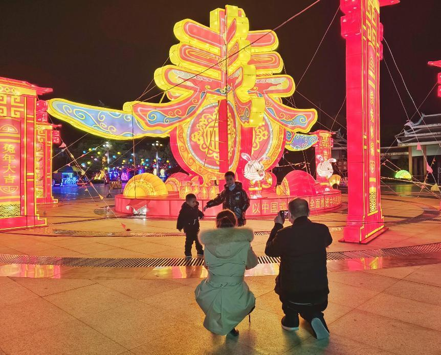 黔东南州三穗县处处张灯结彩,广场上“春”字样的大型灯饰十分显眼,吸引众多群众拍照留念,年味十足。(黔东南州三穗县纪委监委供 肖敏 摄)
