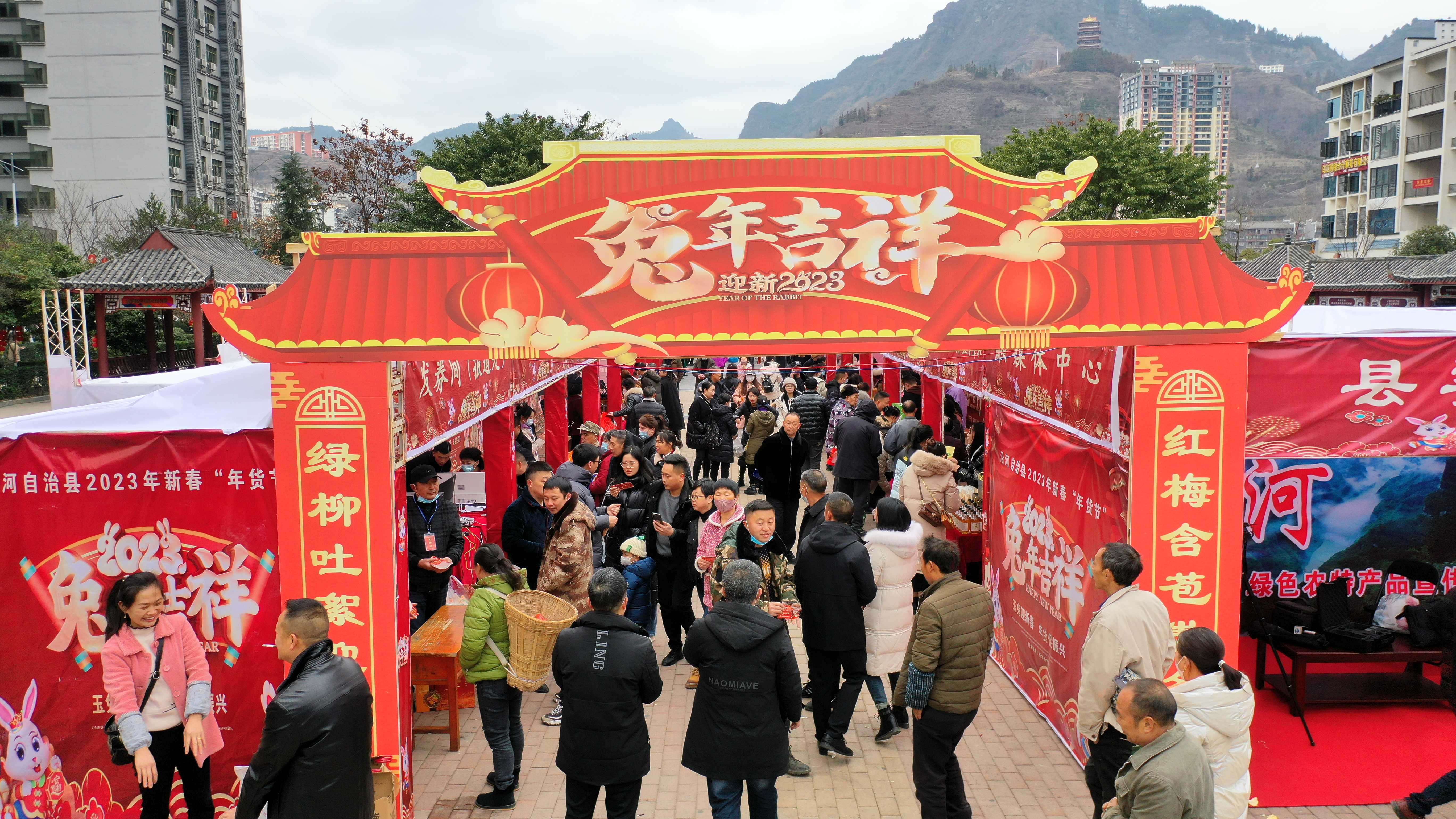 “玉兔迎新春,年货促振兴”。铜仁市沿河自治县在该县政府广场举办年货节活动,活动现场人头攒动,特色农产品琳琅满目,吸引了众多市民前来品尝、选购,“一站式”购置心仪的年货,满满的城市烟火气,呈现一片欢乐祥和喜迎新春的浓厚氛围。(铜仁市沿河自治县纪委监委供 张洪全 摄)