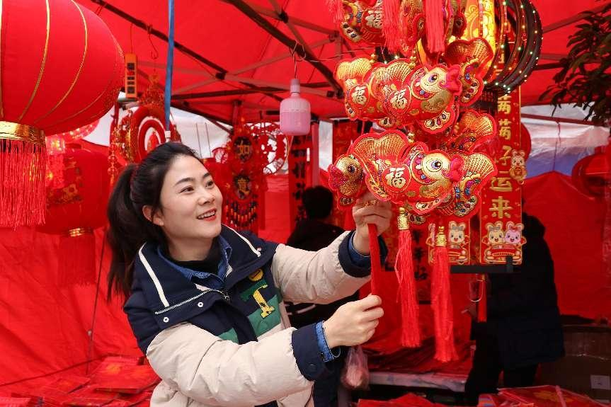 随着兔年春节到来,多家商场、超市及传统年货市场纷纷上新,喜庆红火的春联挂饰、萌趣十足的兔子饰品、栩栩如生的兔子玩偶随处可见,“兔元素”成功抢占年货市场“C位”,城市“烟火气”正不断升腾。(遵义市赤水市纪委监委供 王琳锐 摄)