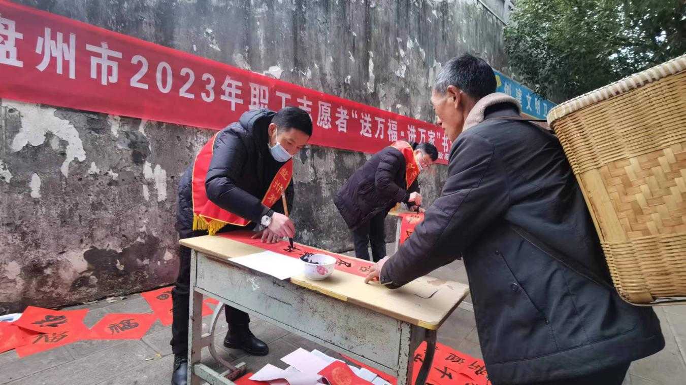 六盘水市盘州市纪委监委结合“送万福·进万家”书法公益活动,会同市书法家到乡镇(街道)为干部群众写廉洁春联、送“廉”到家。图为该市本土书法家在羊场乡为群众书写春联,送上新年祝福。(六盘水市盘州市纪委监委供 李应兰 摄)