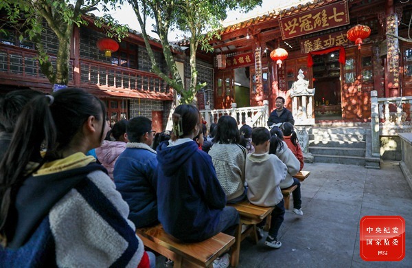 云南省曲靖市师宗县纪委监委挖掘本地乡风民俗中的廉洁元素,组织开展“传承优良家风、涵养廉洁文化”等新春活动,营造以廉为荣的社会风尚。图为在该县竹基镇窦氏祠堂,孩子们正在聆听古代先贤的廉洁家风故事。(云南省曲靖市纪委监委 王勇 摄)