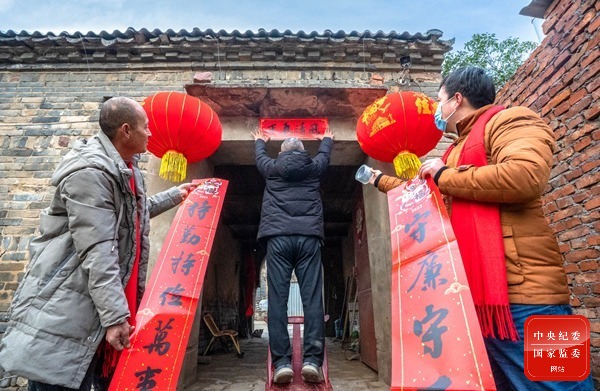 春“廉”载清风,正气盈满门。河南省漯河市郾城区纪委监委印制廉洁春联,把新年的美好祝福和廉洁文化集合成“礼”送到群众手中。图为该区纪检监察干部与裴城镇村民一同贴廉洁春联。(河南省漯河市郾城区纪委监委 王晓 摄)