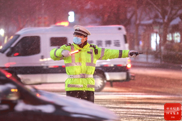 为全力保障春运道路安全畅通,让人们平安与家人团聚,交警顶着雨雪,在车流中指挥疏导交通,用奉献彰显担当。(河南省洛阳市涧西区纪委监委供 段万卿 摄)