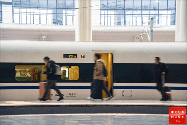 农历腊月,春节前夕,搭乘动车返乡的旅客脚步匆忙,奔向各自的车厢。(浙江省台州市黄岩区纪委监委供 袁杨军 摄)