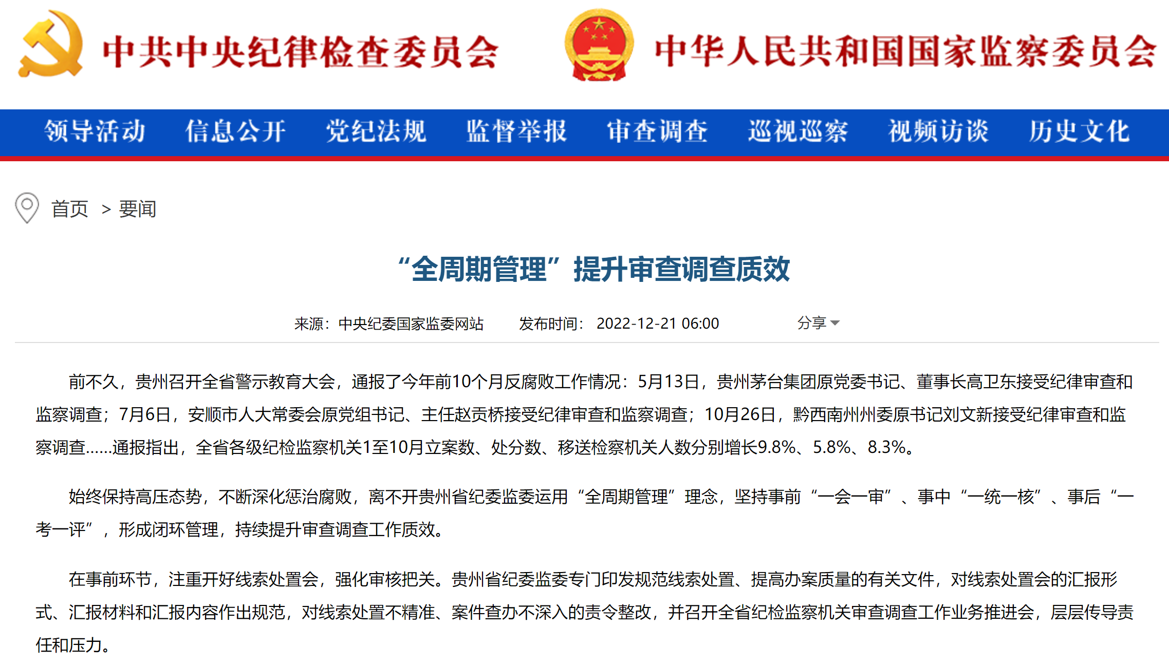 《中国纪检监察报》、中央纪委国家监委网站|“全周期管理”提升审查调查质效