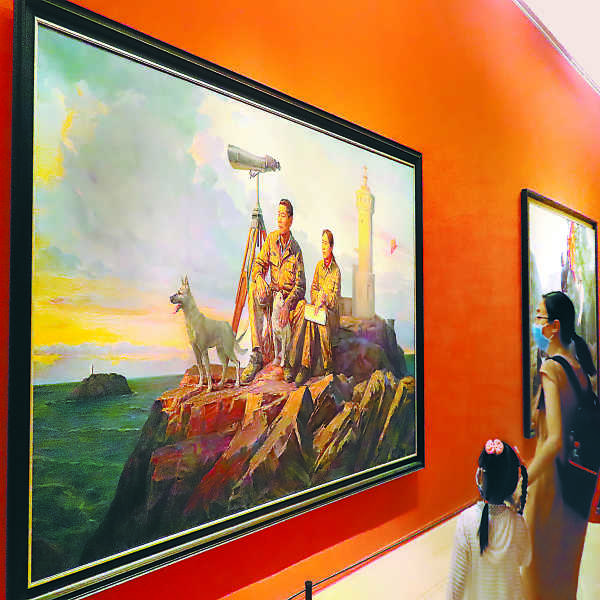 为人民抒写、为人民抒情、为人民抒怀,人民成为此次展览最重要的主题。在各层展厅的重要位置,均展出了表现人民生活、聚焦平凡英雄的作品。十八洞村是我国脱贫攻坚历程中具有“地标”性意义的地方,作品《暖心——十八洞村贫困户精准识别公示会》展现了湖南湘西十八洞村扶贫过程中精准识别贫困户的场景,温暖的氛围表达暖心的主题,让作品充满了浓郁的生活气息;油画《守岛老兵》,表现的是王继才夫妇克服恶劣的自然环境,守岛卫国32年的感人事迹,两人迎着朝霞完成每日的升旗仪式后,并肩坐在礁石上眺望远方等待日出的瞬间,极具感染力;中国画《放飞梦想》以三联画的形式,通过百姓视角阐释“中国梦”的“国家富强、民族振兴、人民幸福”内涵。不少观众表示作品代入感很强,感恩平凡英雄的默默付出,更加珍惜来之不易的幸福生活。