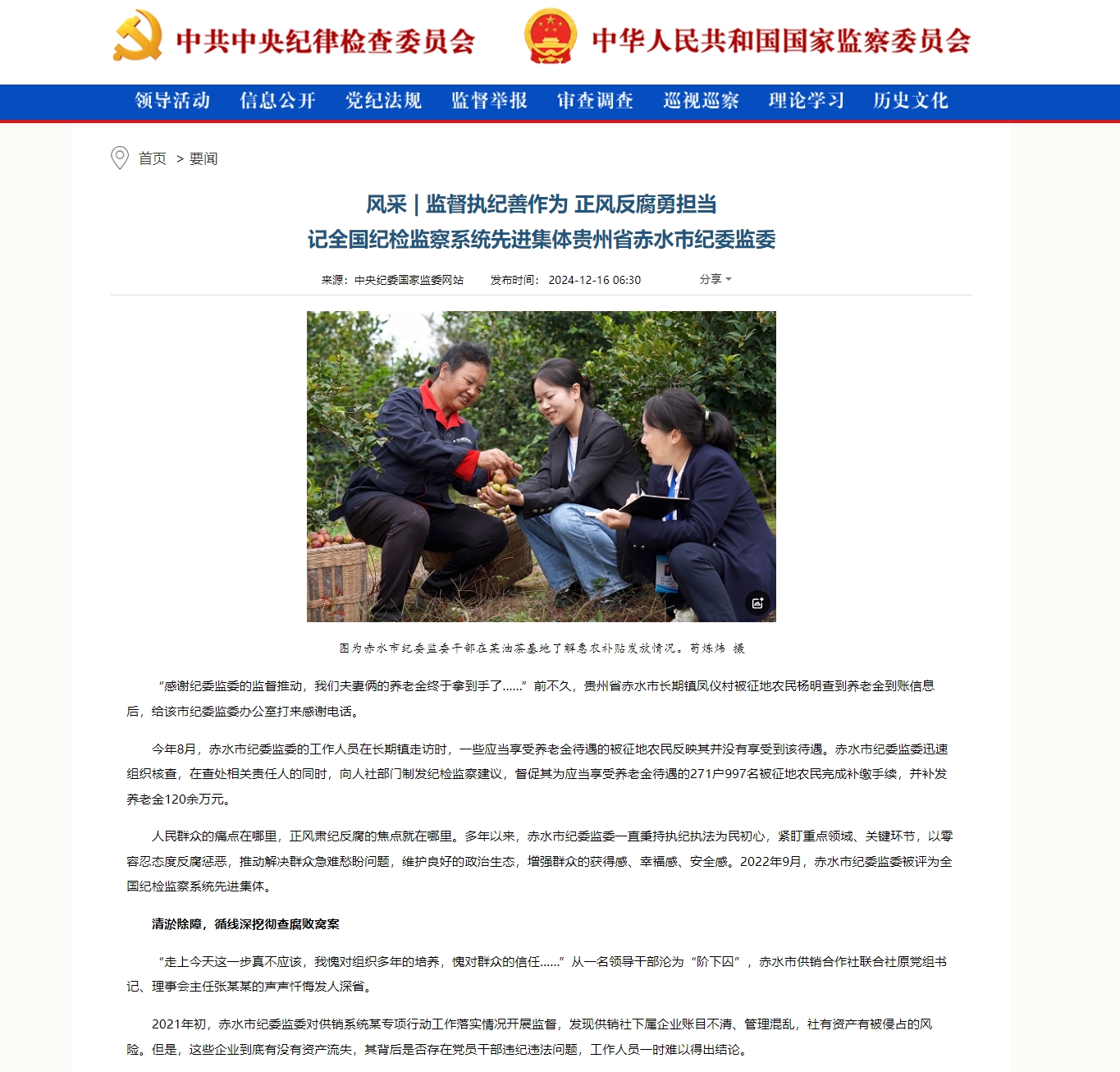 《中国纪检监察报》“新作为”版头条、中央纪委国家监委网站|监督执纪善作为 正风反腐勇担当 记全国纪检监察系统先进集体贵州省赤水市纪委监委
